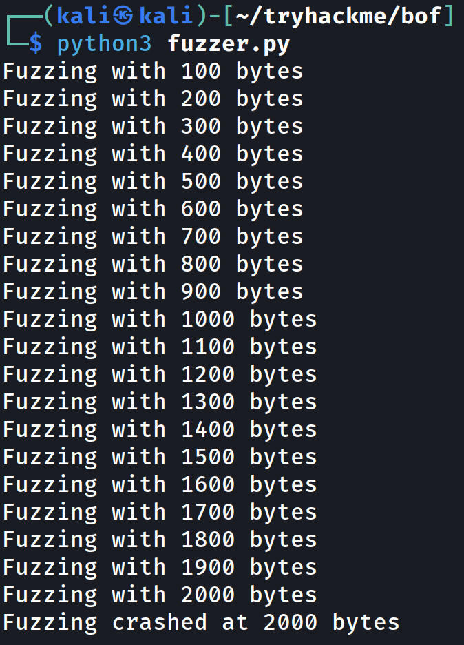 print("Fuzzing crashed at {} bytes".format(len(string) - len(prefix)))