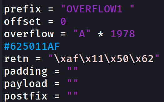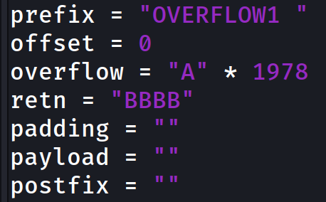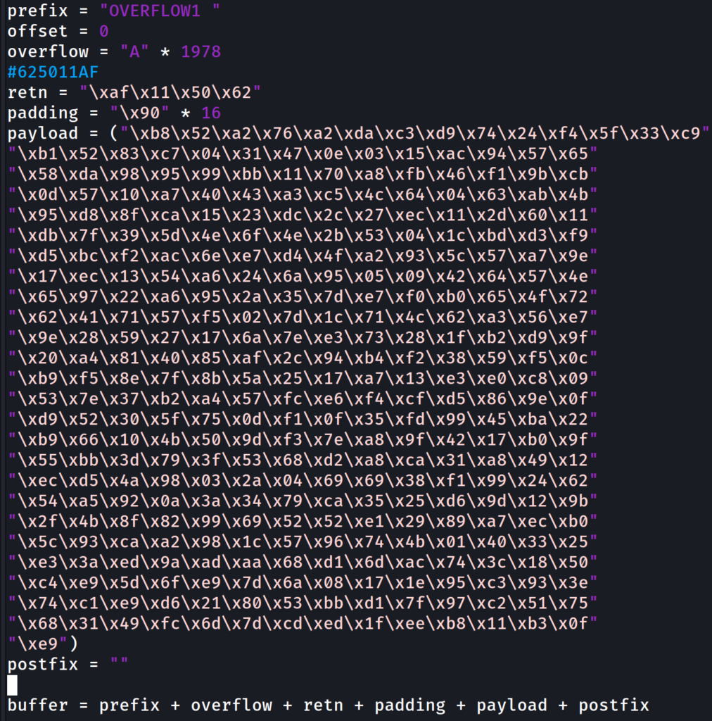buffer = prefix + overflow + retn + padding + payload + postfix