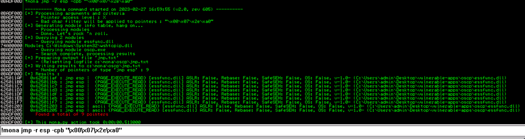 !mona jmp -r esp -cpb "\x00\x07\x2e\xa0"