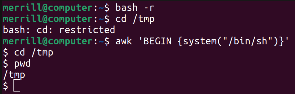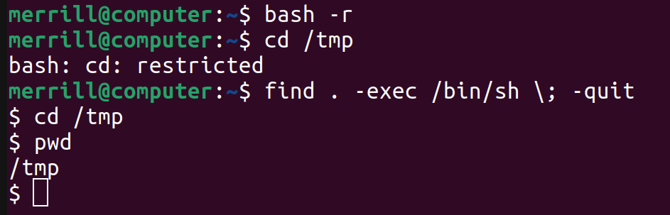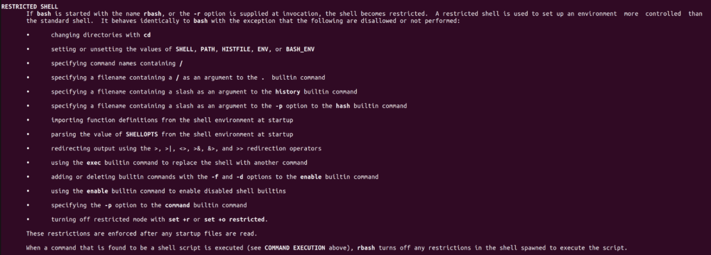 Some of the binaries on Linux have the ability to execute shell commands, which we can use to escape our restricted shell. I’ll list a few common ones here.