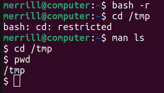 Here we can see that we are indeed in a restricted shell. To escape from here using vim/vi we just need to start vim/vi and run: