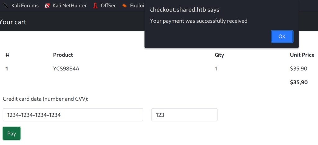 Trying to test the checkout function, we find out that it doesn’t actually send a request. It just creates an alert.
