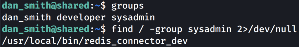 From here we can take dan_smith’s ssh key and ssh as him. Continuing our enumeration as dan_smith, we see that we are a part of the sysadmin group. Looking for files owned by this group reveals a custom binary.