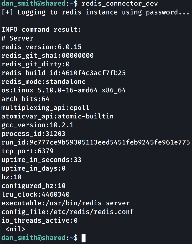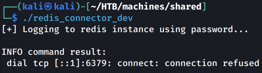 Copying the file to our local machine and running it shows that it tries to login to Redis at localhost on port 6379 and then fails.